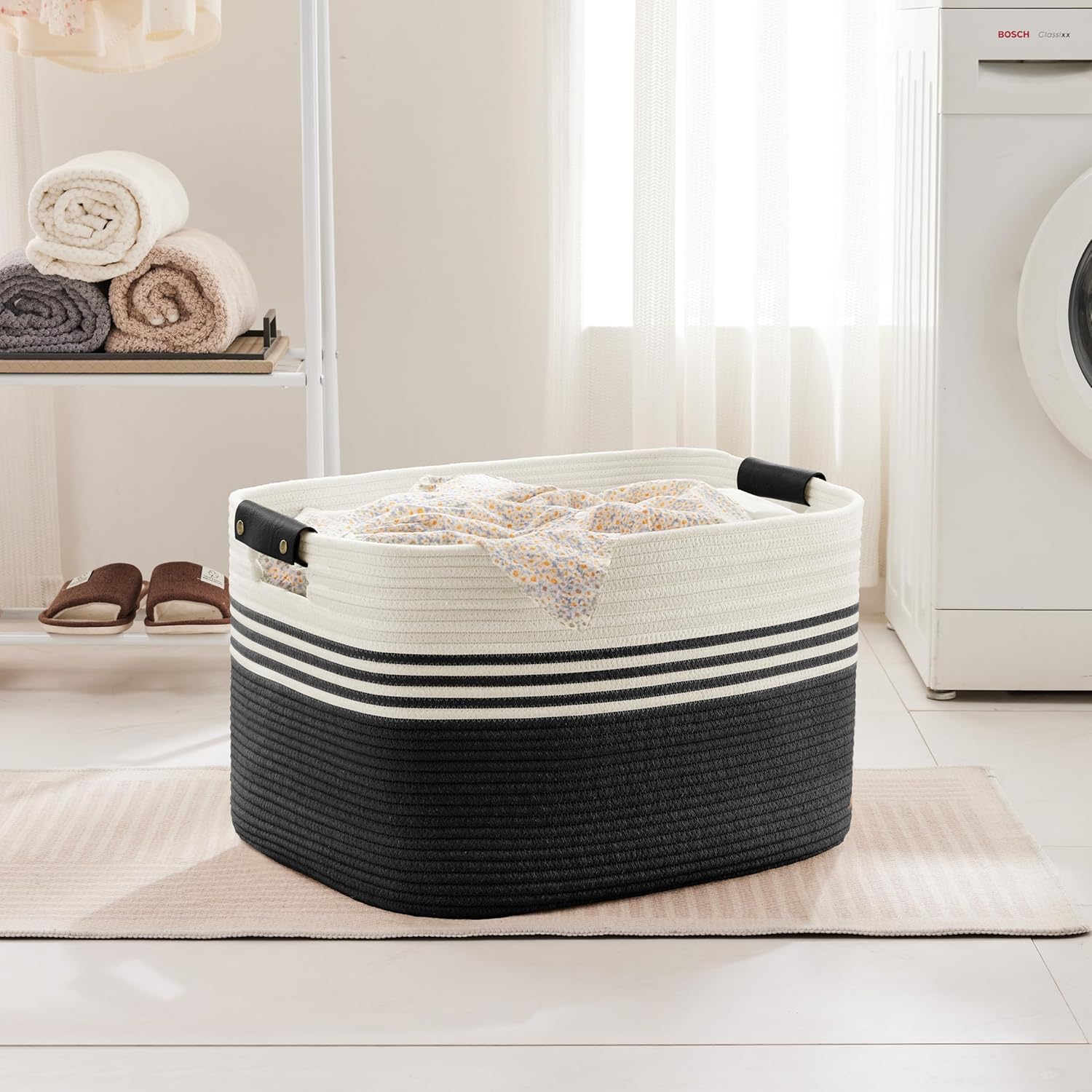 86L Extra Large Laundry Basket with Leather Handles for Living Room Storage, Woven Rope Baskets for Blanket, Kids Toy, Gifts, Wicker Hamper for Bedroom Dirty Clothes, 24"x16"x14" White Black
