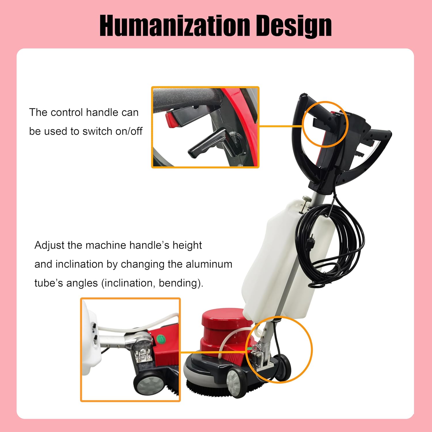 - [Humanization Design] The control handle can be used to switch on/off the machine. Adjust the machine handle’s height and inclination by changing the aluminum tube’s angles (inclination, bending). The edge of the head of the Floor Scrubber is equipped with anti-collision rubber rings, making it safer. The two rubber wheels are anti-slip, wear-resistant and quiet.