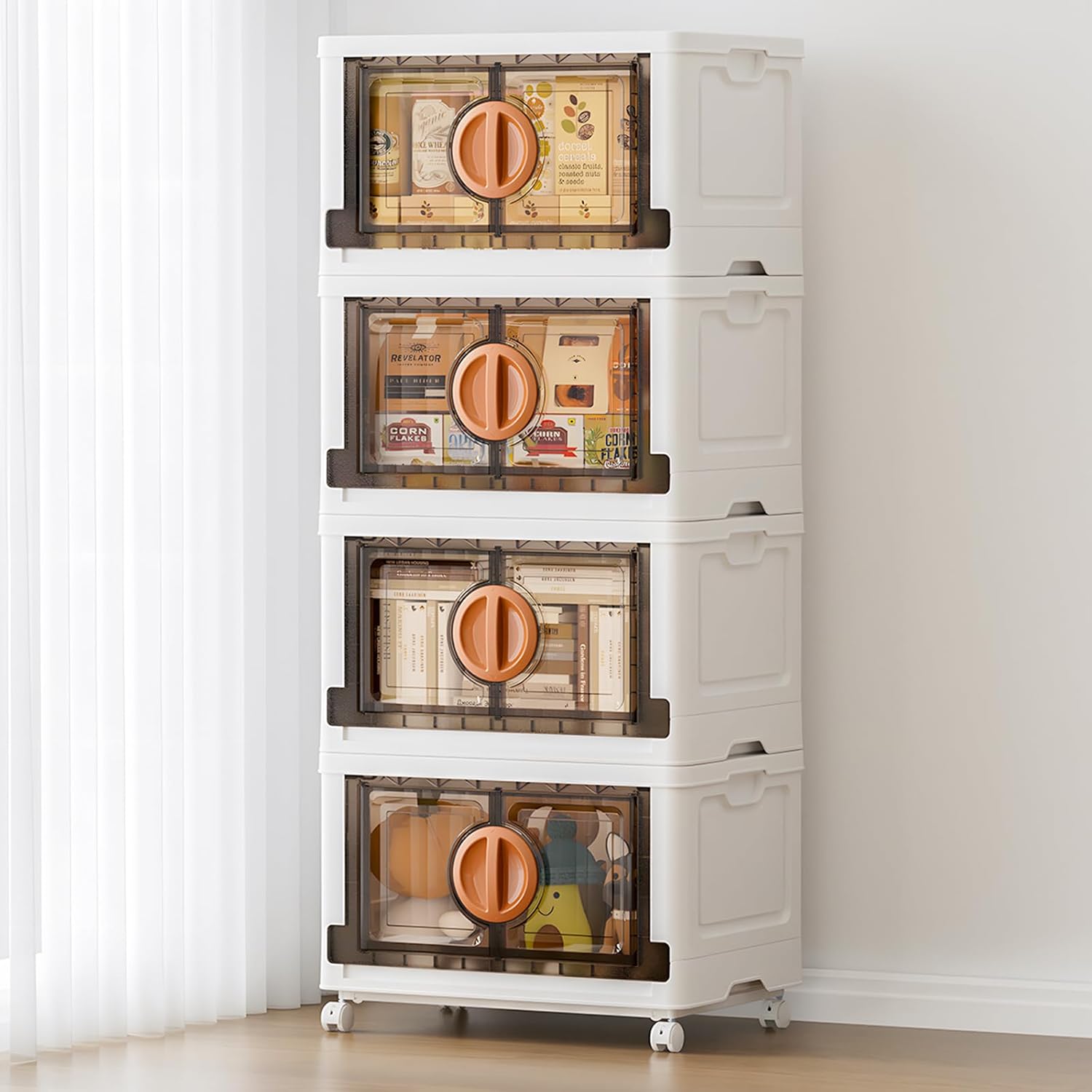 JEKO&JEKO 332Qt Lockable Stackable Storage Bins with Lids, Collapsible Closet Organizer with Wheels, Plastic Cabinet Drawer for Clothes, Dorm Room 4 Pack (White)