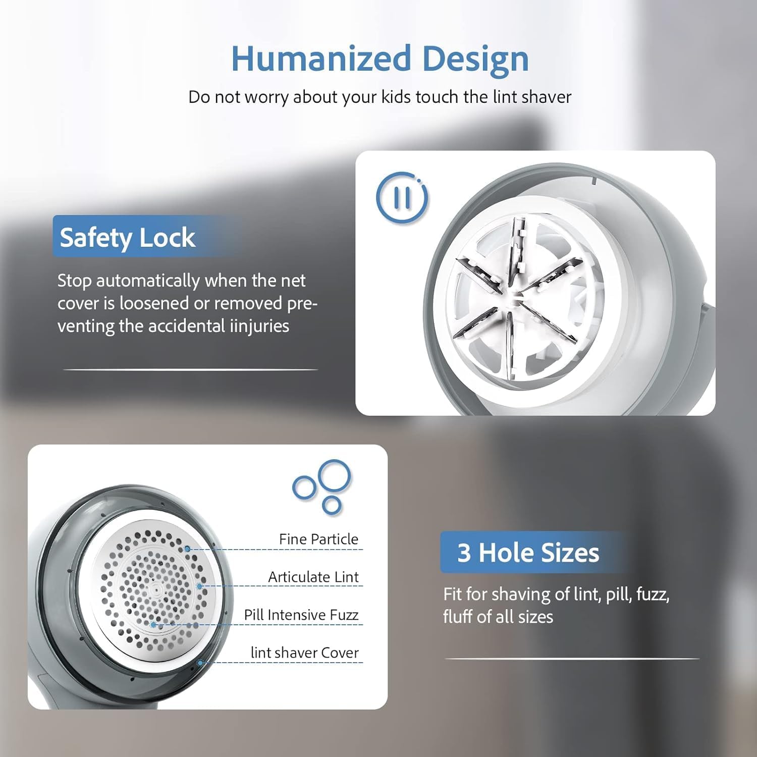 - Safe Protection : This fuzz remover fabric shaver is equipped with an upgraded version detachable stainless steel large mesh cover with a diameter of 70mm. The slight arc can fit the clothes and keep a safe distance from the cutter head, thus protecting the fabric surface from damage. If the mesh cover of the electric lint remover shaver becomes loose or falls off, it will stop working immediately to prevent fabric damage.