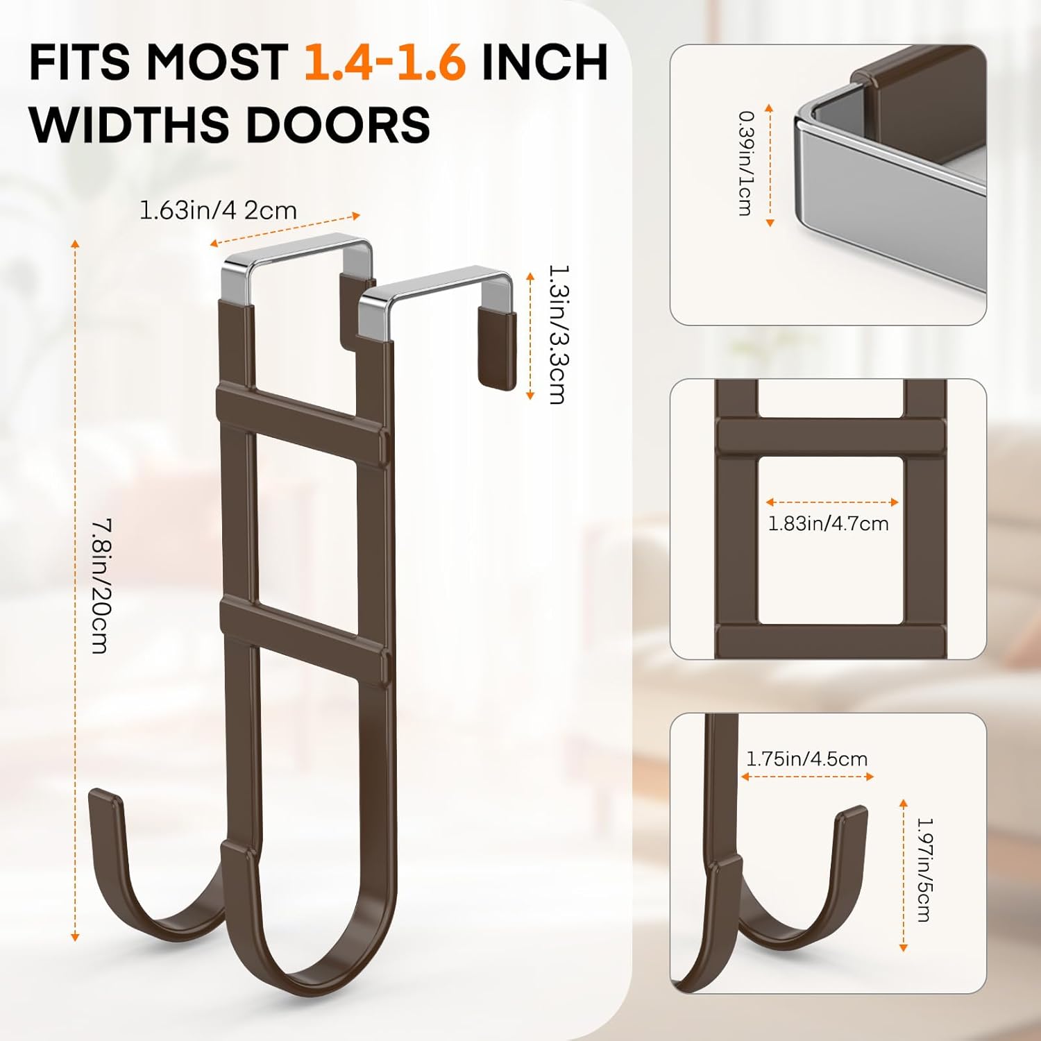 FYY Over The Door Hooks - 4 Pack Heavy Duty Dual-Hook Organizer Hanger with Non-Slip Rubber for Towels, Clothes, Hats & Bags Use in Bathroom, Bedroom, Kitchen - Fits Interior Doors Up to 1.6" Brown