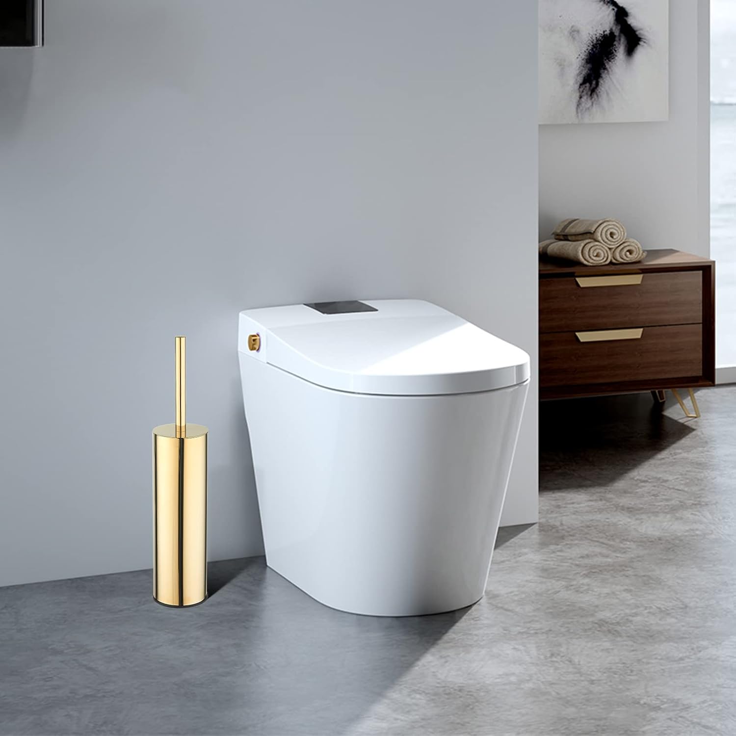 Toilet Brush and Holder Set Gold Stainless Steel, 304 Heavy Duty Round Toilet Brush Set – Rust Resistant, Long Handle, Replacement Heads, Floor Standing Bathroom Toilet Cleaning Brush