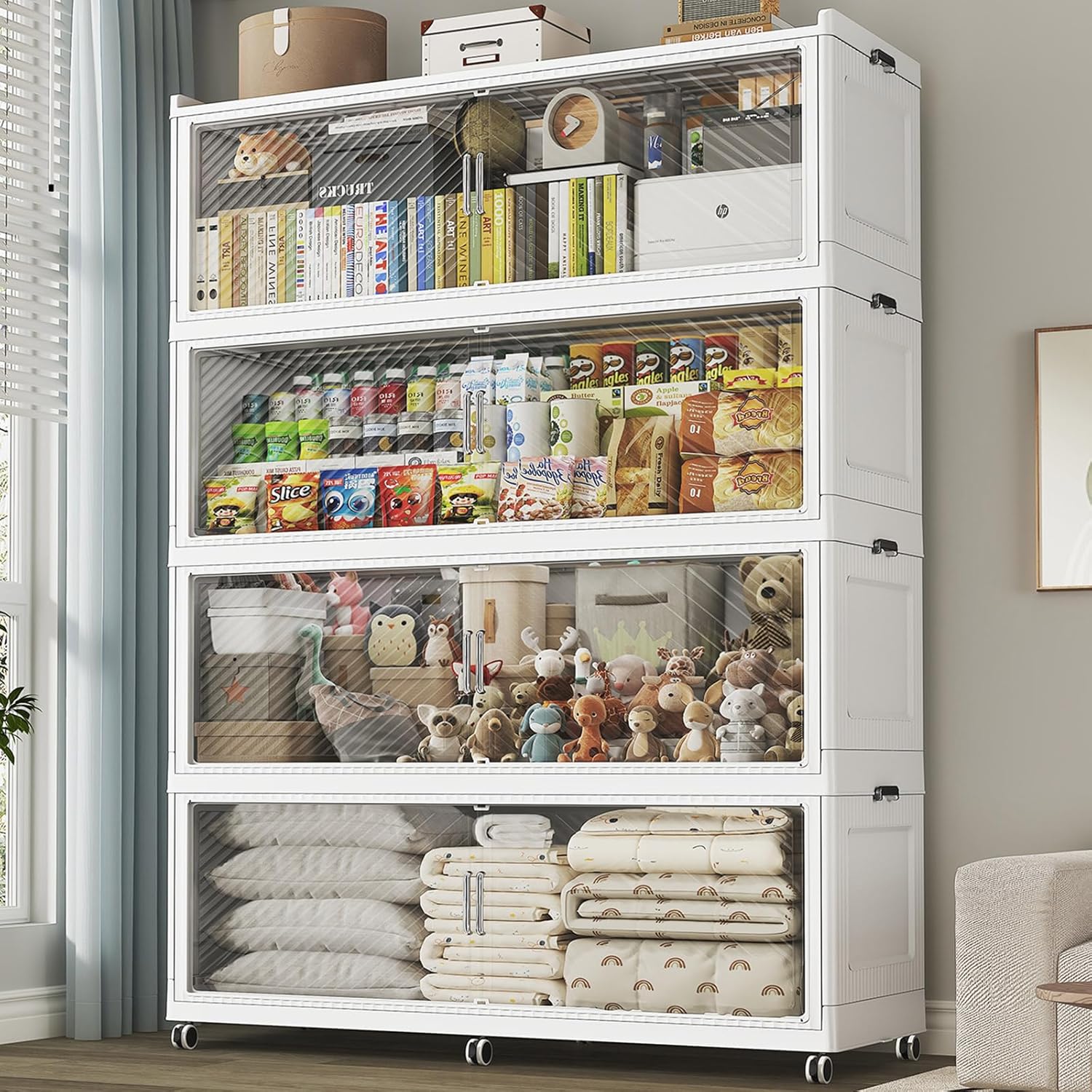 - 【Two Ways to Open & Magnetic Doors】The collapsible storage bins with lids and wheels feature a dual access way, allowing for both top and front door openings, and with clear brown windows for easy visibility. The super huge storage bins with open front doors are equipped with magnetic lock buckles to prevent dust from entering the cabinet.