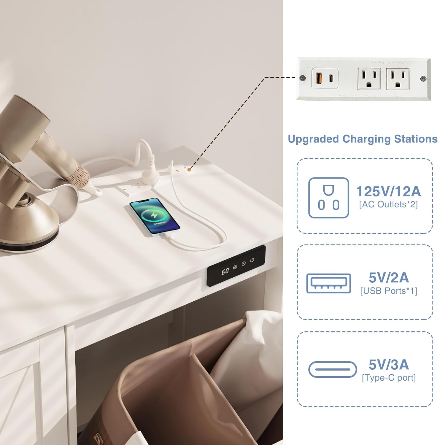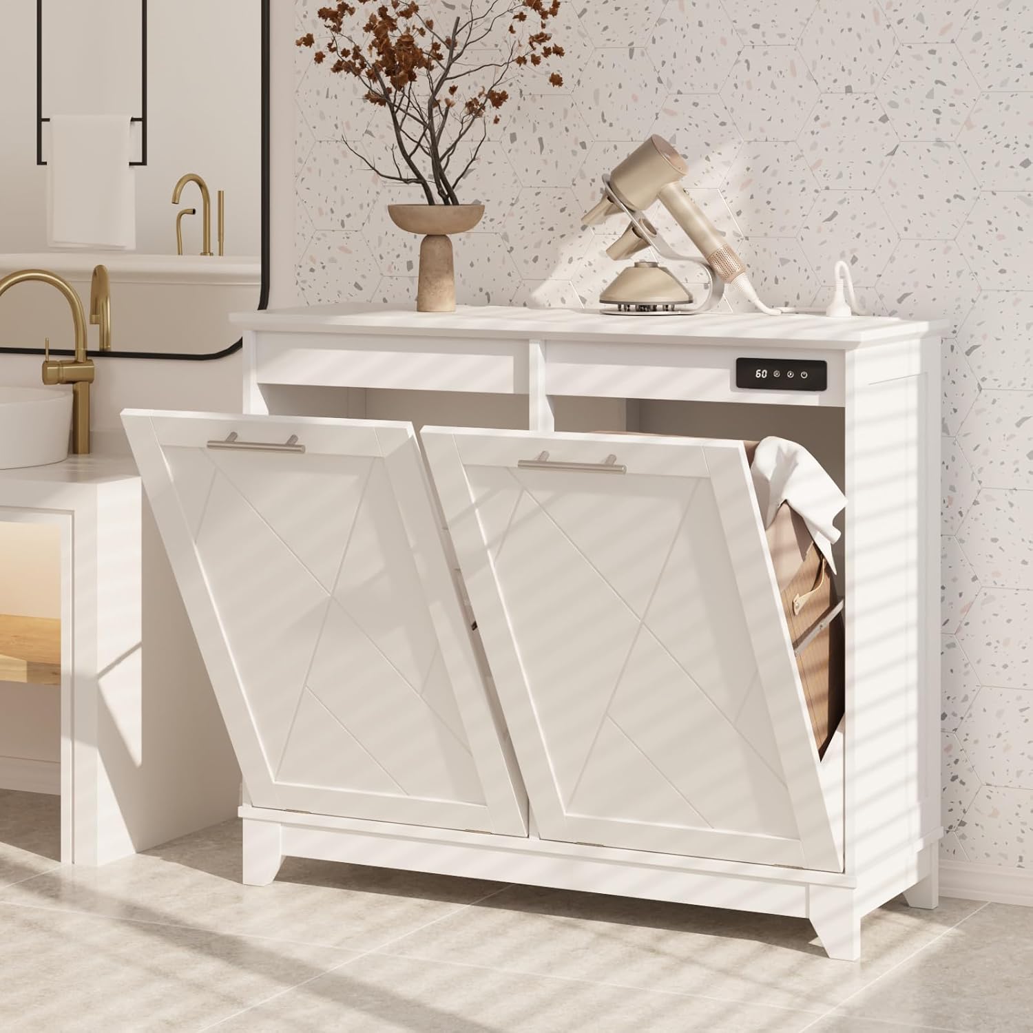 Double Tilt Out Trash Can Cabinet, 10 * 2 Gallon Garbage Trash Bin with Charging Station and Deodorizing Function, Dog-Proof Storage Cabinet for Hidden Bathroom Laundry Hamper, White