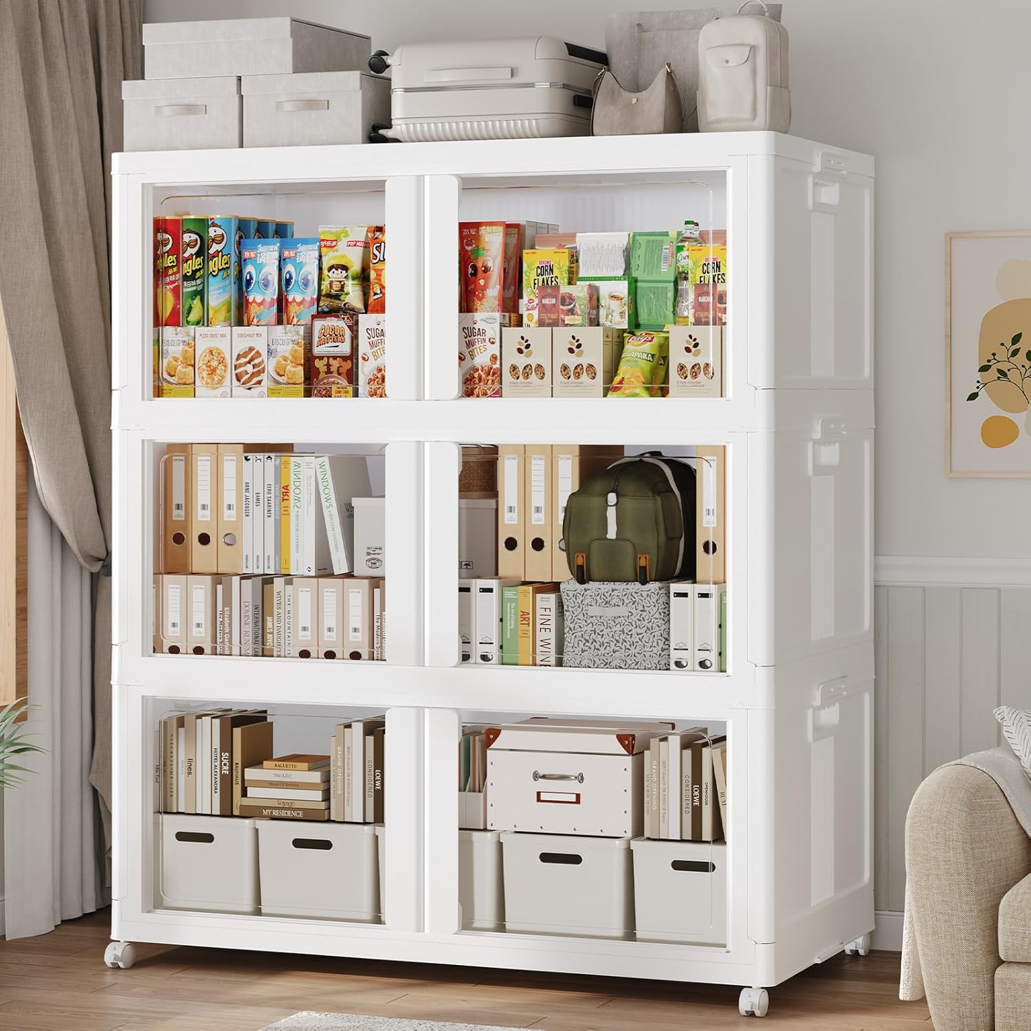 600Qt Stackable Storage Bins with Lid and Wheels, 150Gal Plastic Closet Organizer and Storage Drawer, Large Collapsible Storages Box Cabinet with Clear Door for Home Kitchen, 3Pack White