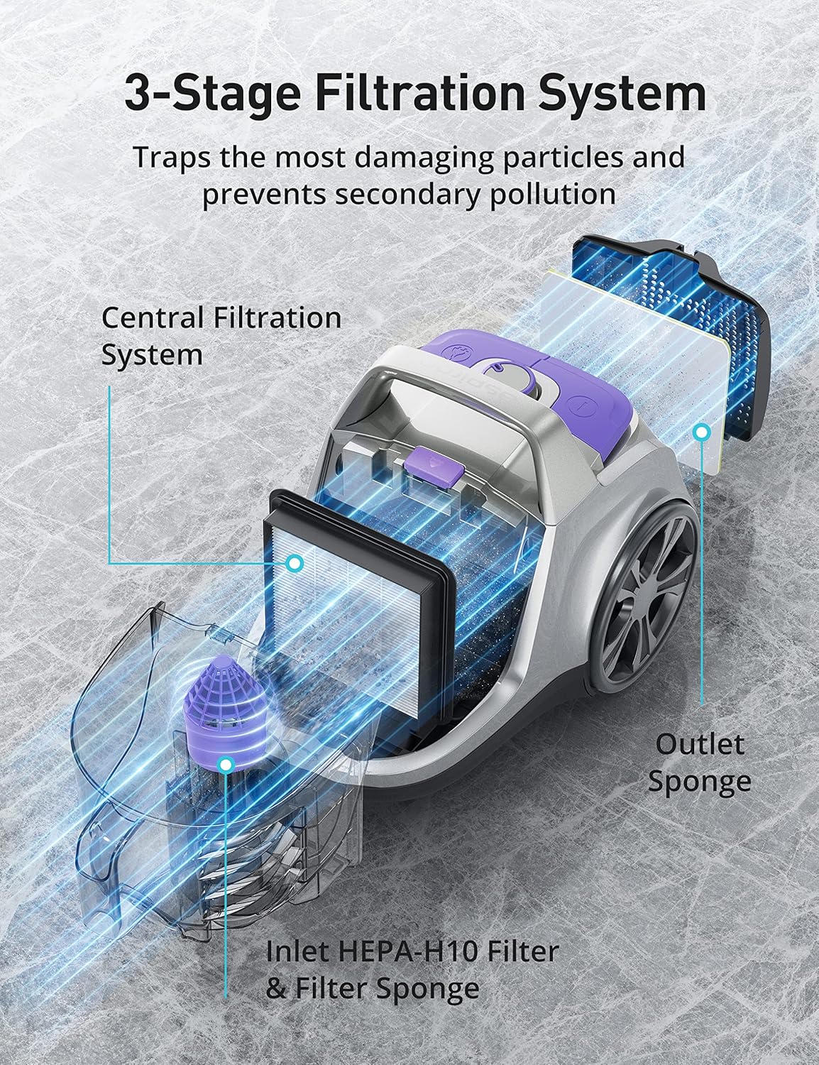- No Air Pollution: Cyclone technology separates dust from the air; a fully sealed system with HEPA-H10 inlet filter traps fine dust, and particles and expels clean air through the outlet sponge - No worries of secondary pollution or allergy