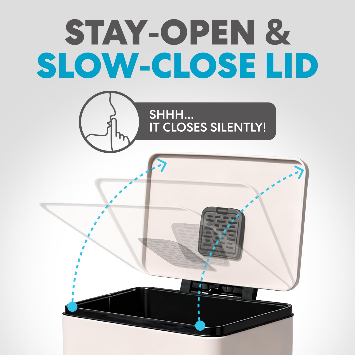 - Quiet-Close Lid: Lid closes quietly and gently without slamming. Hands Free and Fingerprint Proof: Hands-free operation with durable a metal foot pedal and fingerprint-resistant stainless steel finish leads to your trash can staying cleaner longer