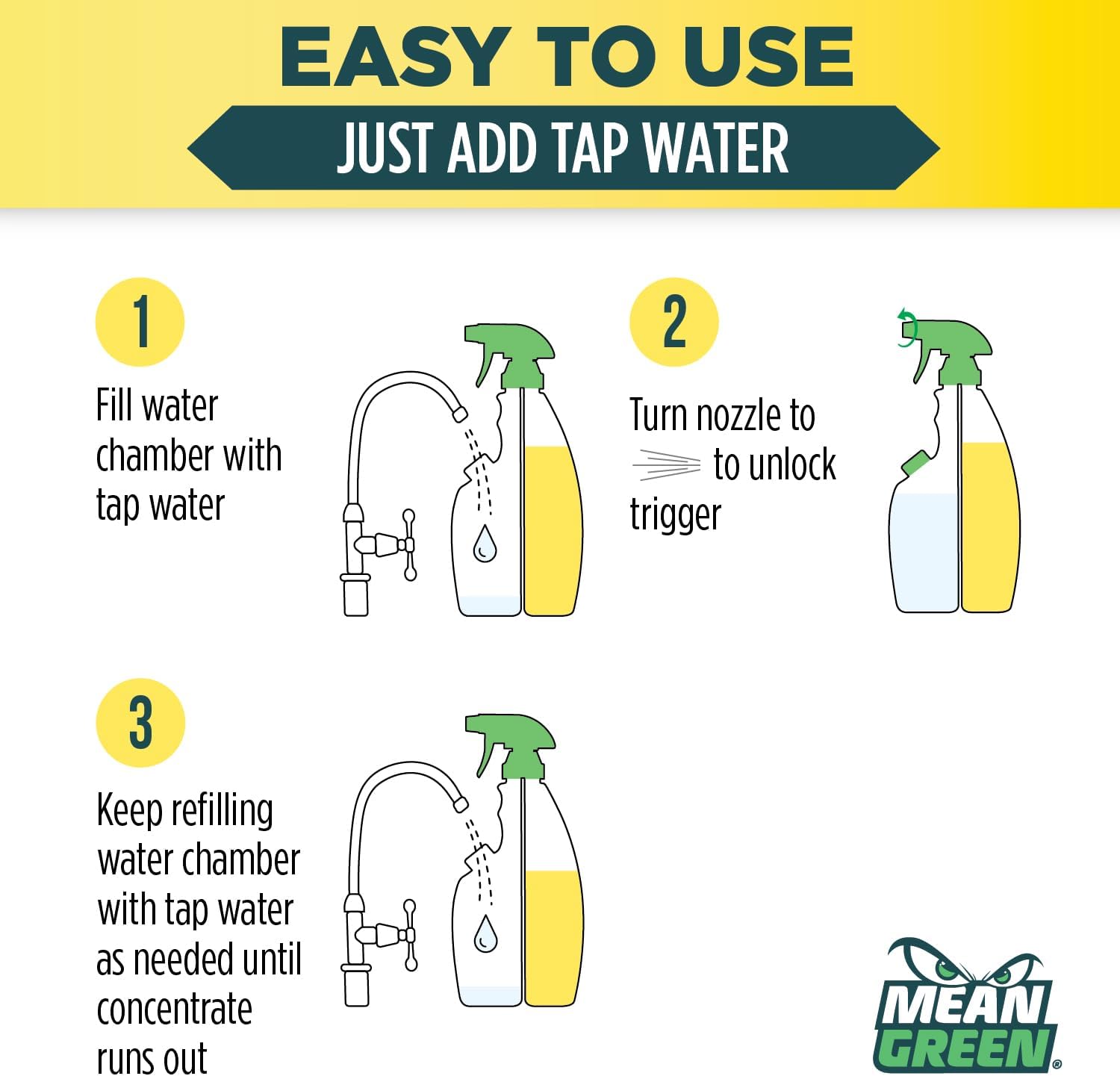 - HELP REDUCE WASTE: No additional purchases required, just refill with tap water. One Mean Green Ultra Powered Concentrate replaces four 28oz bottles of cleaner