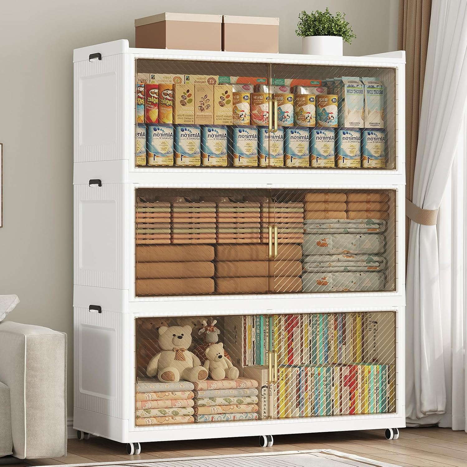 - 【Two Ways to Open & Magnetic Doors】The collapsible storage bins with lids and wheels feature a dual access way, allowing for both top and front door openings, and with clear brown windows for easy visibility. The super huge storage bins with open front doors are equipped with magnetic lock buckles to prevent dust from entering the cabinet.